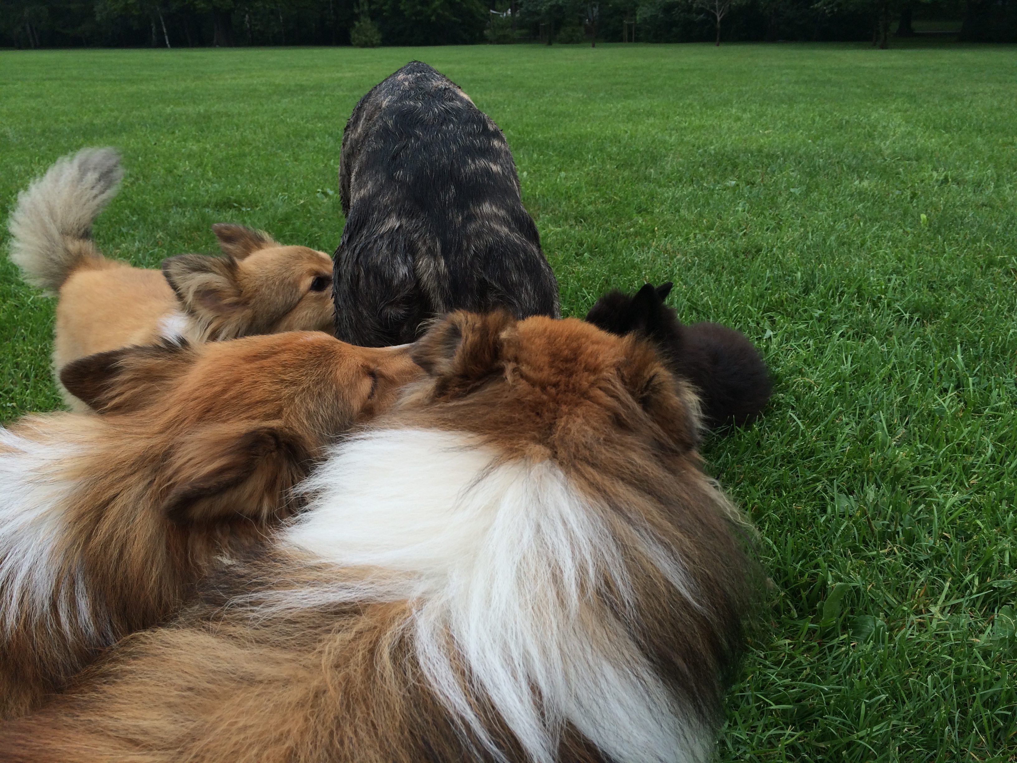 Így aztán amikor Ardi féltesójának gazdija össznépi sheltie-találkozót szervezett, sokan lelkesen jelentkeztünk, hogy összeengedjük a szőrgombócokat egy hatalmas hancúrra. Ugyan az esős idő miatt csak kevesen jöttek el, de a móka megvolt. Becsatlakozott egy gröni-baba és pár agár, gond nélkül bevonták őket is a buliba. Cukik ezek az ugatós kis görcsök, na.