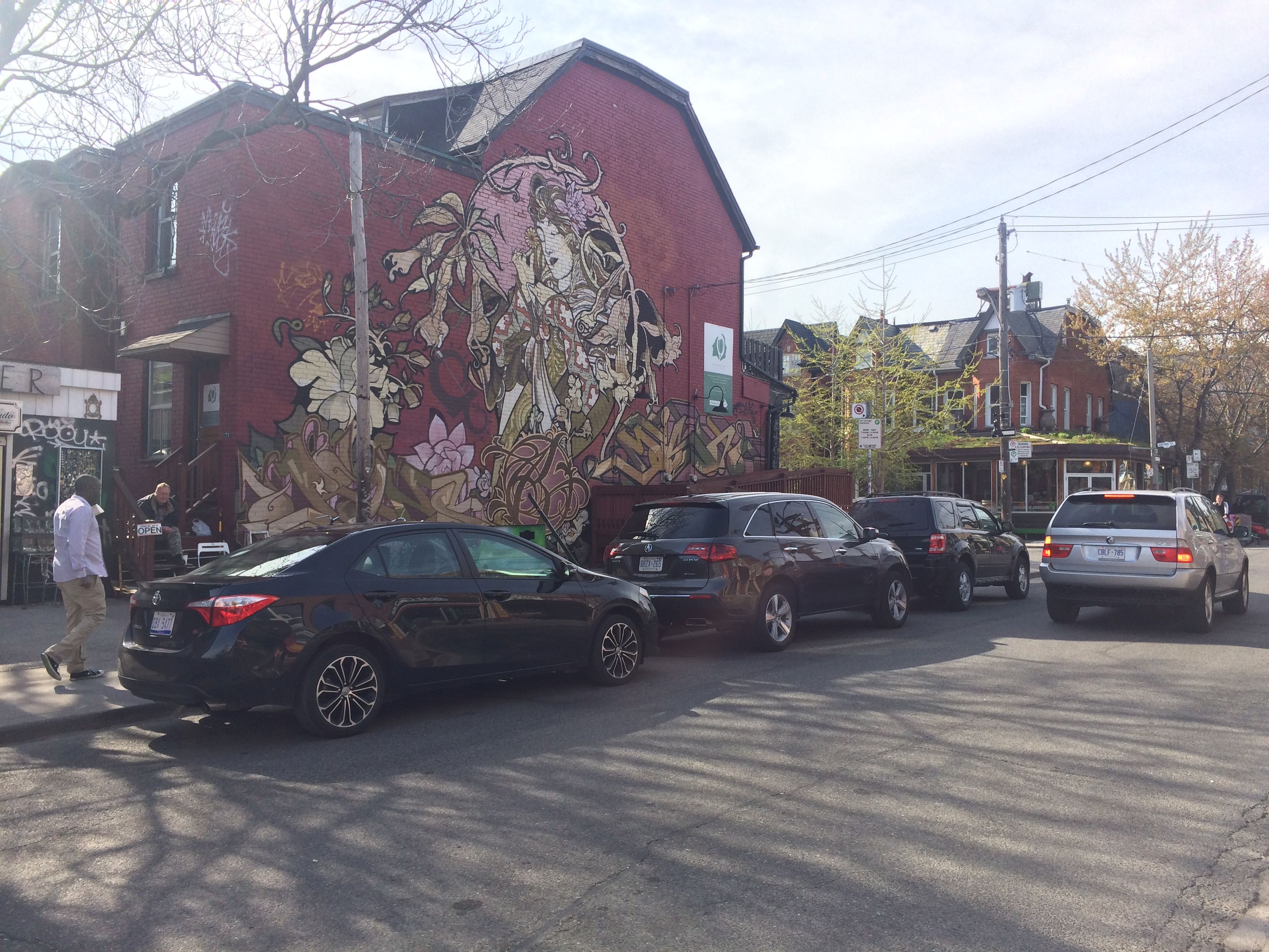 Olcsó a benzin (kb. fele, mint itthon), plusz tágasan terpeszkedő városok = mindenki autóval jár. A sztrádán Toronto felé volt vagy négy sáv, plusz egy belső sáv külön azoknak, akik ketten vagy többen ülnek az autóban, mi is ebben a töküres sávban hasítottunk, míg a többiben állt a dugó. Tényleg mindenki egyedül volt a hatalmas benzintemetőkben (láttunk pár Nissan Juke-ot, elég picinek tűntek a többiek mellett). Szeretik a nagyot, terpeszkedőt sok mindenben, ennek megfelelően a sávok és a parkolóhelyek is szélesebbek, mint nálunk, nem gond az egy ívből parkolás. A sztráda olykor követhetetlen rendszerként tekeredik, nem csak jobbra, de balra is vannak leágazások, a városokban a lámpás kereszteződésben elég macera a balra kanyarodás, mert az egyenesen szembejövő sáv is akkor kap zöldet, és a gyalogosok mindenek felett álló szent tehenek, mindig elsőbbségük van, és akkor se dudál rájuk senki, ha egy épp kanyarodó tanker előtt állnak nekik telefonálva átandalogni.